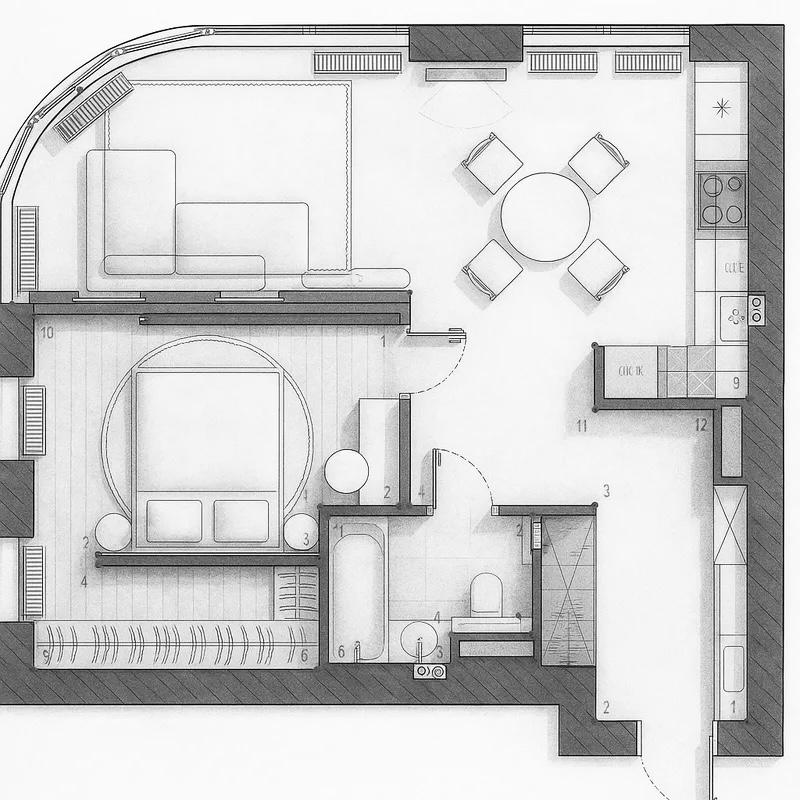 Планировочное решение: просторная кухня-гостиная, спальня с гардеробной, ванная комната, вместительная прихожая.